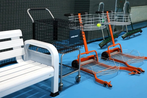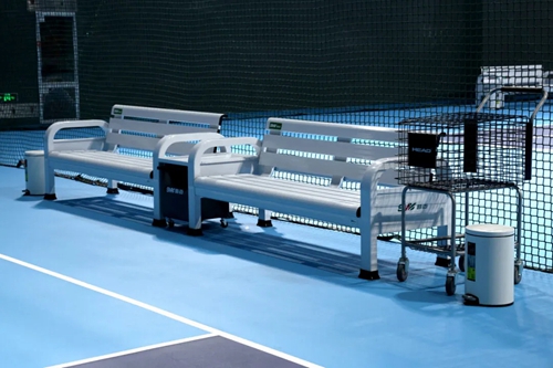 場(chǎng)邊配備數(shù)組休閑座椅、撿球推車