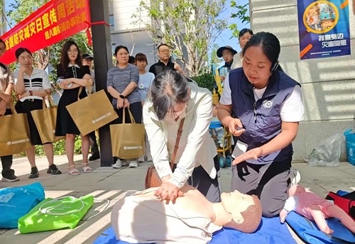 在互動體驗環(huán)節(jié),工作人員展示結繩演練并指導實操,保障群眾掌握基本結繩逃生技能。現場還設置了仿真人體模型,醫(yī)護人員指導群眾進行心肺復蘇操作練習,同時為群眾演示海姆立克急救法操作流程。