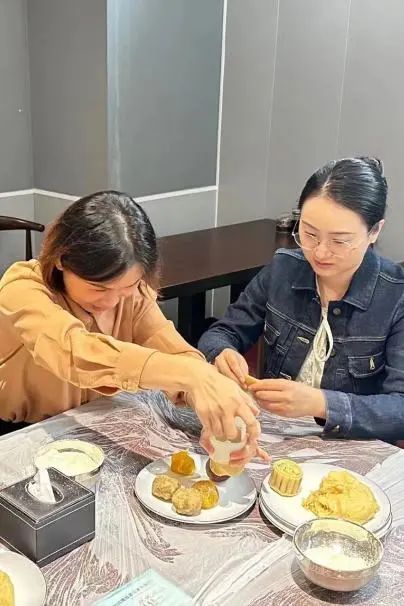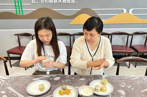晶瑩剔透的餅皮、沁甜馥郁的餡料、精致的雕花模具,在專業(yè)老師的指導(dǎo)下,變成一個(gè)個(gè)美味的月餅。